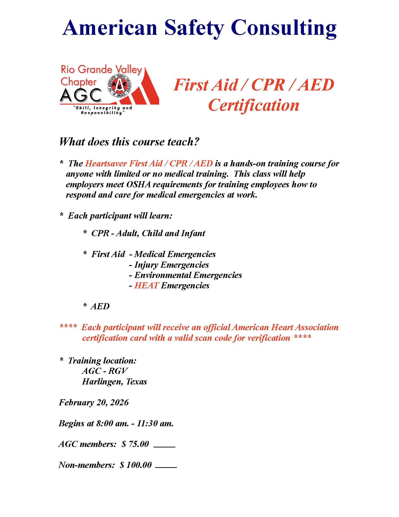 « All Events American Safety Consulting – First Aid CPR AED Training February 20 @ 8:00 am - 11:30 am « ESC Safety Consultants – Flagger Training Add to calendar Google Calendar iCalendar Outlook 365 Outlook Live Details Date: February 20 Time: 8:00 am - 11:30 am Event Categories: CPR/First Aid Training, Safety Training Venue RGV-AGC Harlingen 6918 W. Expressway 83 Harlingen, TX 78552 United States Phone 956-423-4091 View Venue Website