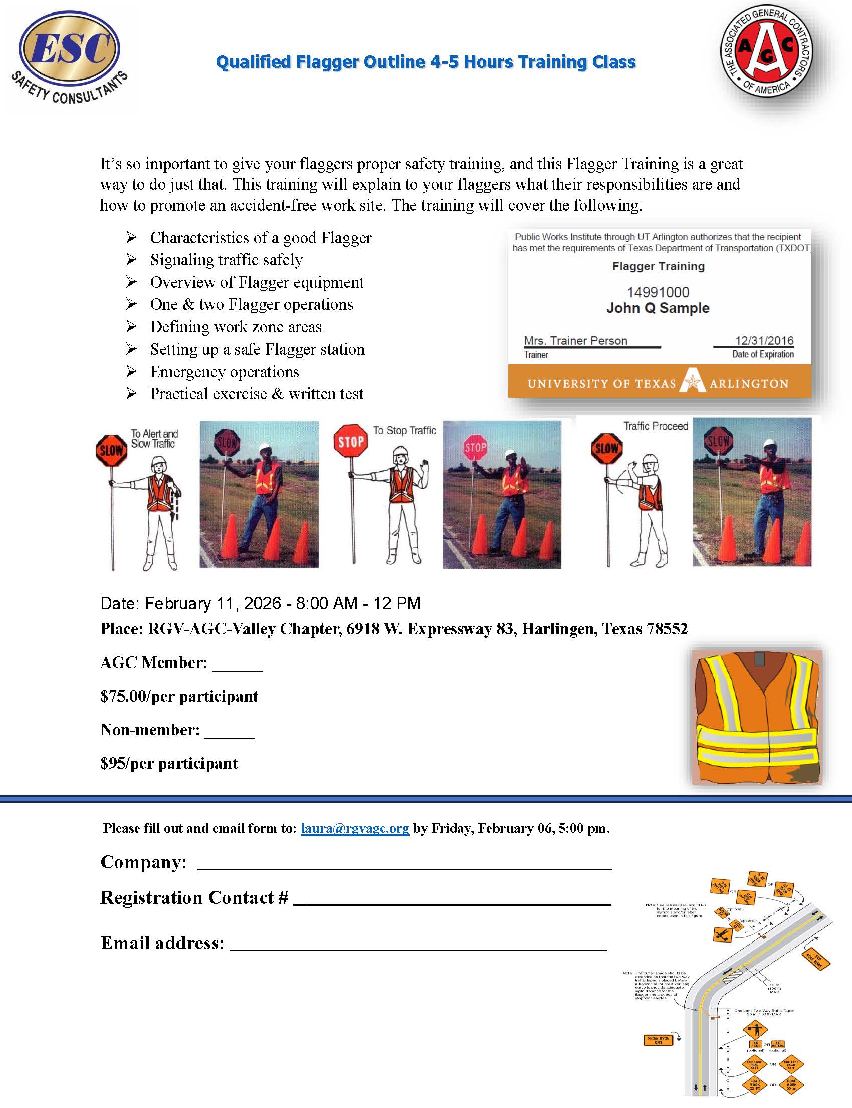 « All Events This event has passed. ESC Safety Consultants – Flagger Training February 11 @ 8:00 am - 12:00 pm « 76th Annual “Black Jack & Blue Jeans” – Installation of Officers, Awards Banquet & Casino Night American Safety Consulting – First Aid CPR AED Training » Add to calendar Google Calendar iCalendar Outlook 365 Outlook Live Details Date: February 11 Time: 8:00 am - 12:00 pm Event Category: Safety Training Venue RGV-AGC Harlingen 6918 W. Expressway 83 Harlingen, TX 78552 United States Phone 956-423-4091 View Venue Website